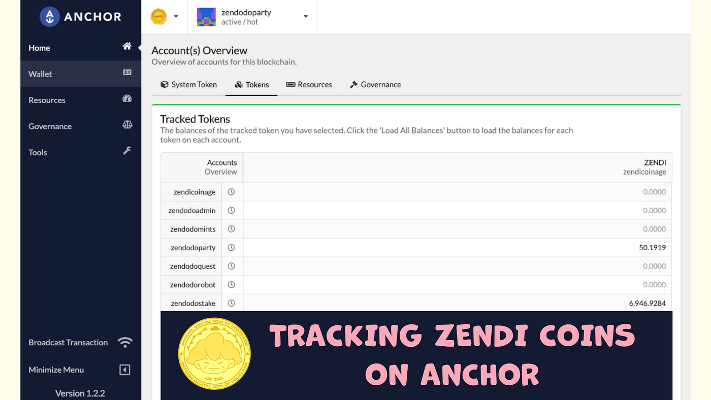 Once done, you may head back to your account overview, tokens tab and click “Load All Balances”. You can now track the Zendi Coins in your Anchor Wallet!